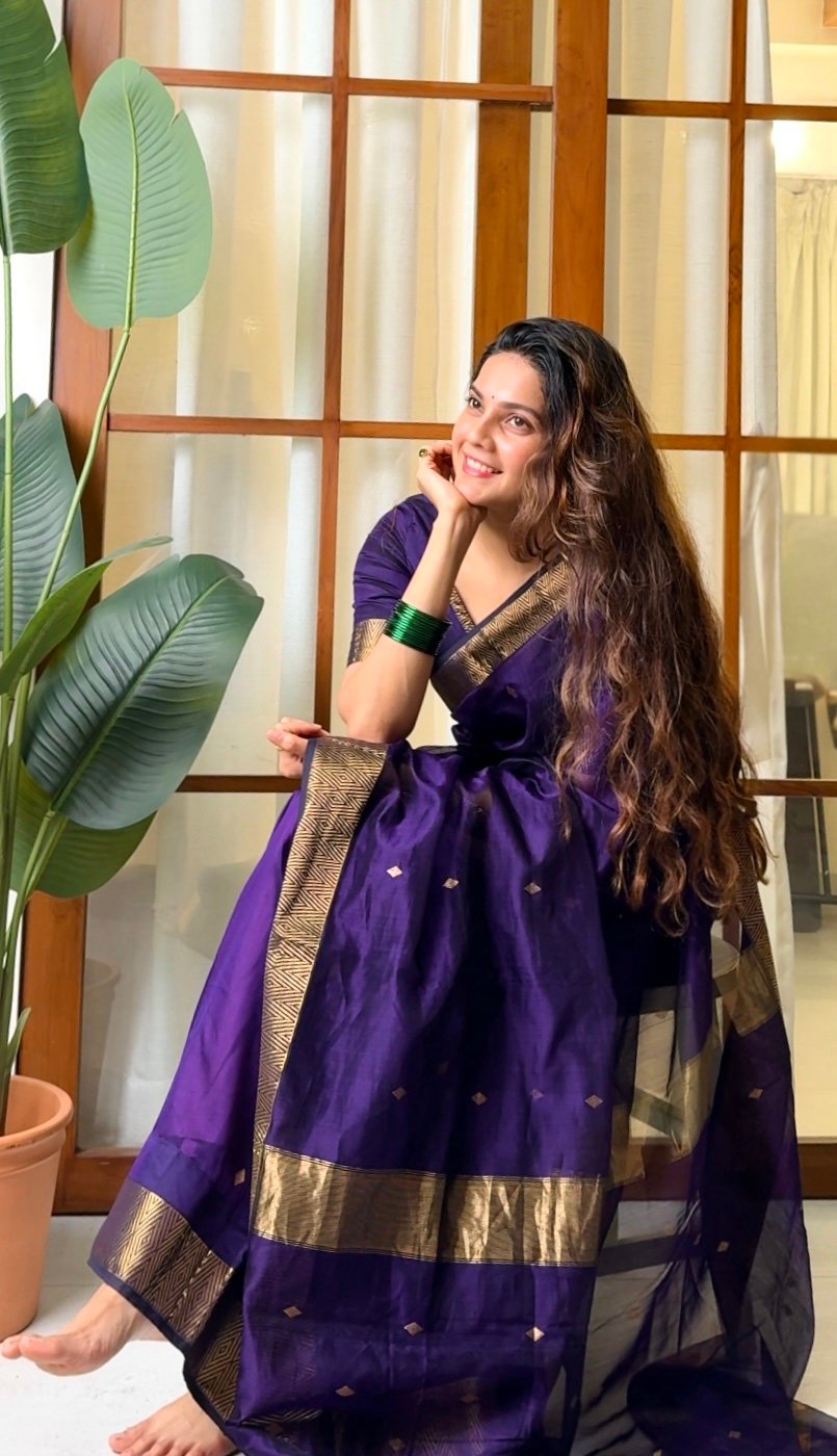 ₹3,500.0Gorgeous purple shade handloom Maheshwari silk cotton saree with golden zari buttas on the body and a distinct good zari work on the border. Comes with a running purple Pallu and purple blouse with border design Saree length: 6.3 mtrs including blouse