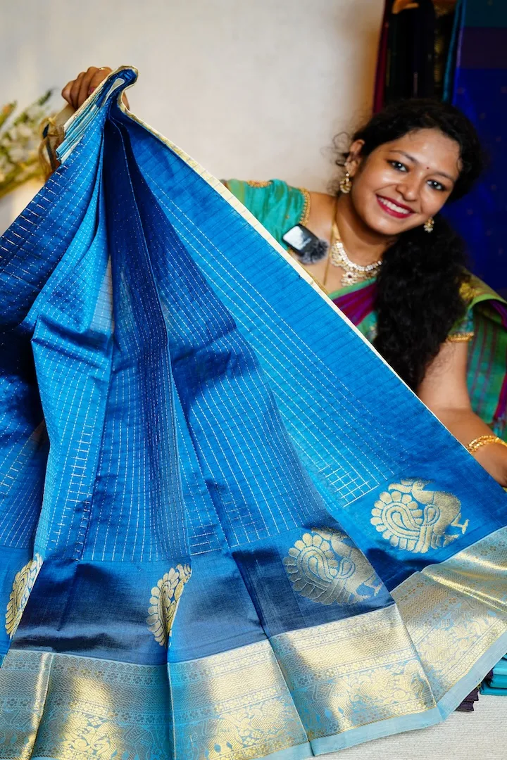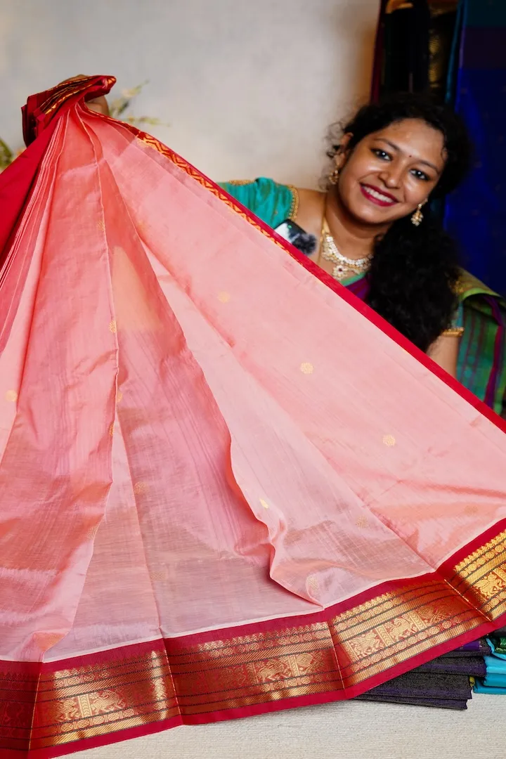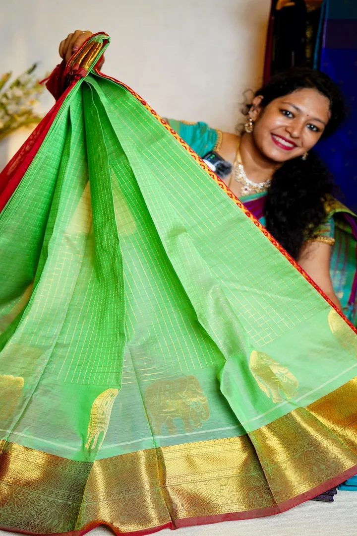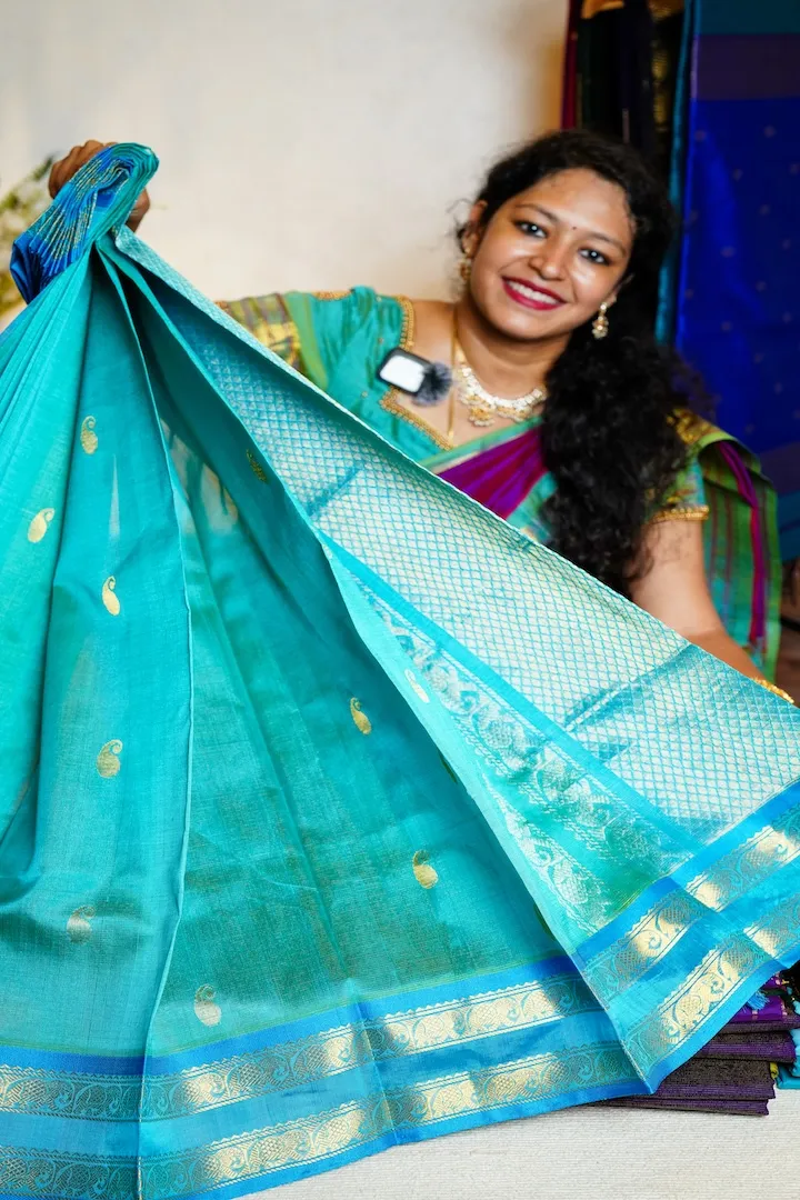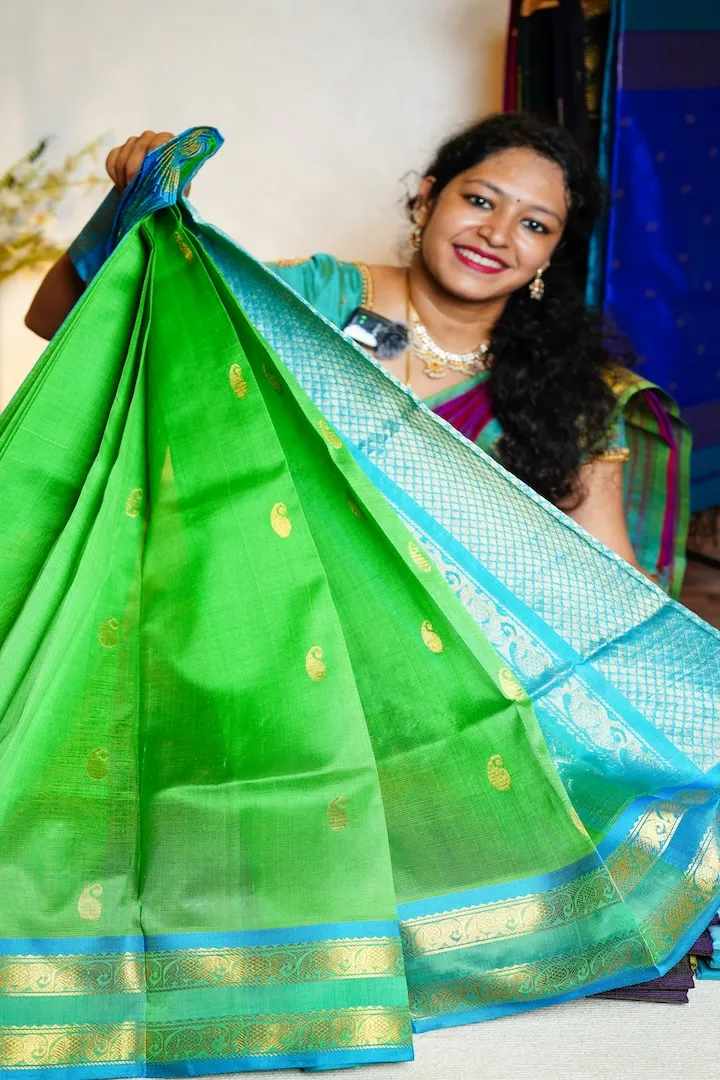 ₹5,000.0Gorgeous handloom Kanchi Silk Cotton saree. Kanchi Silk Cotton sarees are one of the most exquisite and divine weaves that come from the ancient town of Kanchipuram, Tamil Nadu. The motifs, designs and colours are a treat to the eyes of the beholder and the saree is a breeze to the one who drapes it. The Maharani Series is a collection of the finest handloom Kanchi silk cotton and Korvai silk cotton weaves in the most exquisite designs like Vaira Oosi, Mayil Chakram Kattam, Retta Pettu, Lakshadeepam, Vertical Zari Stripes, unique double zari (gold and silver) Elephant buttas, etc. Owning a Kanchi silk cotton is like owning a piece of tradition. Saree Weight: 650 gms Blouse: Contrast pallu colour