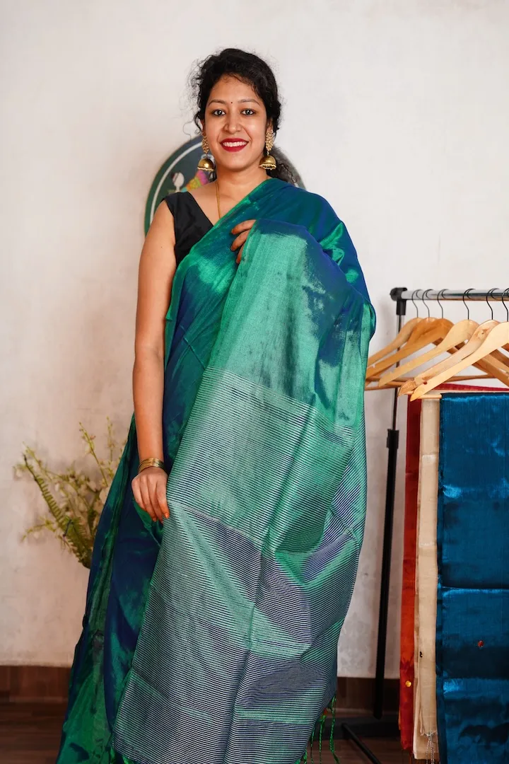 ₹1,200.0Lightweight and easy to drape peacock green colour plain tissue cotton saree with grand lines on the pallu. Saree comes without blouse.