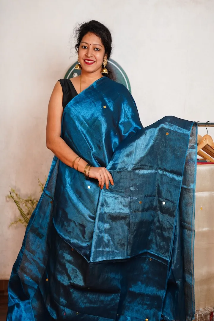 ₹1,200.0Lightweight and easy to drape cerulean blue colour tissue cotton saree with woven chumkis on the body. Blouse: Cerulean Blue