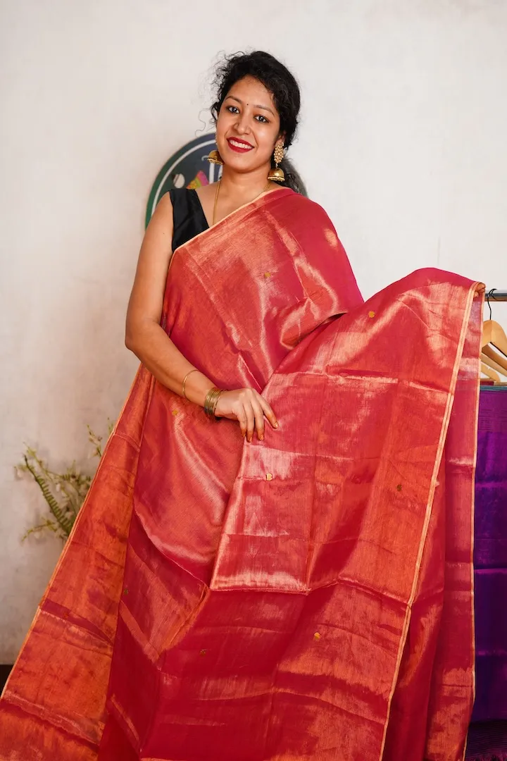 Stunning tissue sarees that are extremely light weight and easy to drape. Has a beautiful shine on the body and a golden border. Saree comes with running blouse.