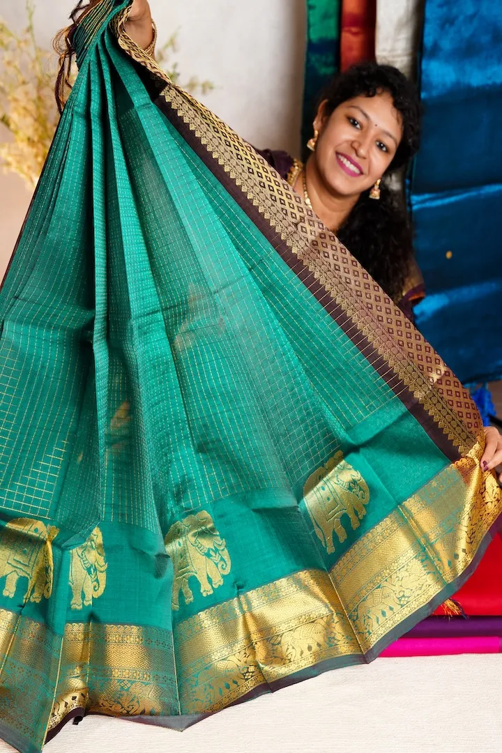 ₹5,600.010-15 days for despatch. Gorgeous handloom Kanchi Silk Cotton saree. Kanchi Silk Cotton sarees are one of the most exquisite and divine weaves that come from the ancient town of Kanchipuram, Tamil Nadu. The motifs, designs and colours are a treat to the eyes of the beholder and the saree is a breeze to the one who drapes it. The Maharani Series is a collection of the finest handloom Kanchi silk cotton and Korvai silk cotton weaves in the most exquisite designs like Vaira Oosi, Mayil Chakram Kattam, Retta Pettu, Lakshadeepam, Vertical Zari Stripes, unique double zari (gold and silver) Elephant buttas, etc. Owning a Kanchi silk cotton is like owning a piece of tradition. Saree Weight: 650 gms Blouse: Contrast pallu colour