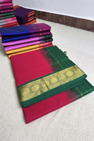 ₹3,200.0Vibrant 7 yards Vaira Oosi Semi Silk Cotton sarees with contrast zari border, pallu and blouse. Perfect for the festive season, these sarees are extremely vibrant and are pleasing to the eye. The zari border on these sarees has traditional Kanchi designs like Mango, Rudraksham, Peacock, Parrot, Thazhampoo, Araimadam. Saree Weight: 560 gms Blouse: Contrast pallu colour Wash Care: Normal hand wash