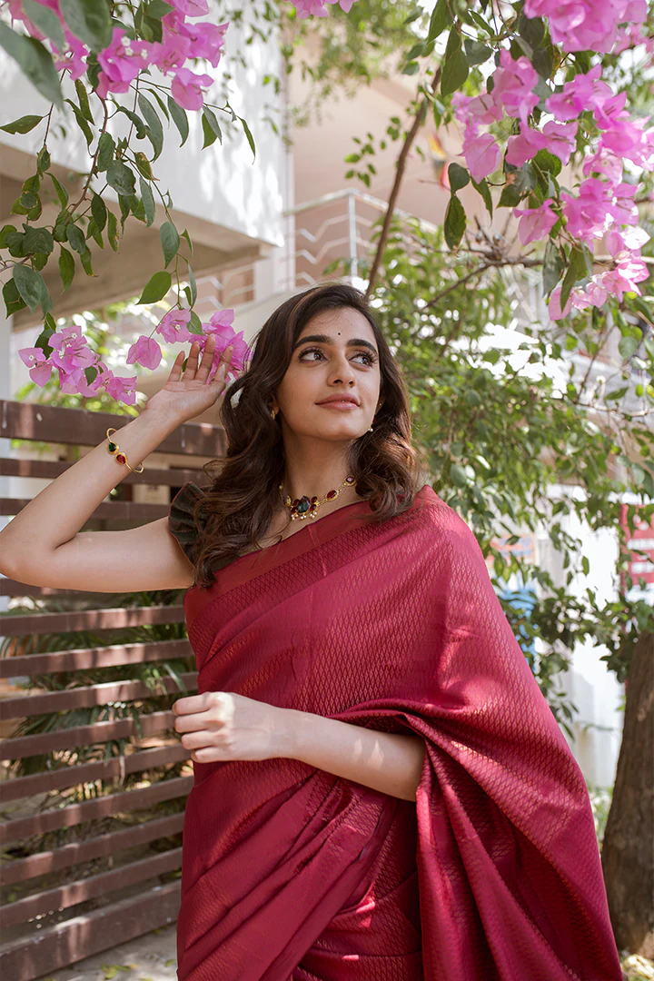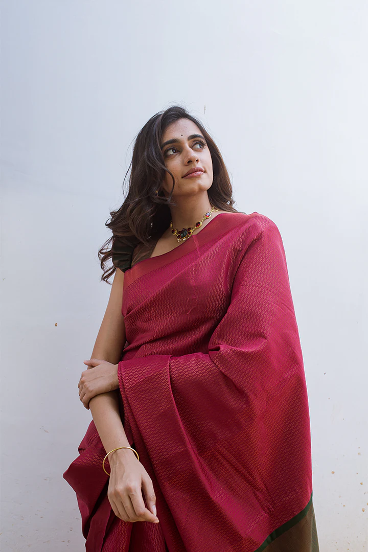 Saree shade: Magenta body with green pallu and blouse, Soft brocade design; soft and easy to drape.
