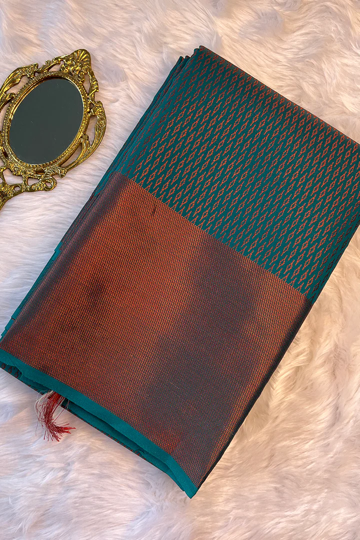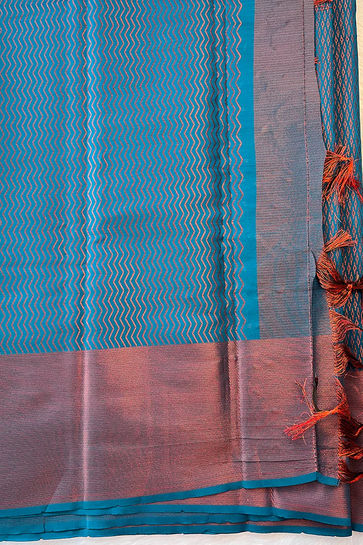 Saree shade: Ramar blue body with woven copper zari design. Soft brocade design; soft and easy to drape.