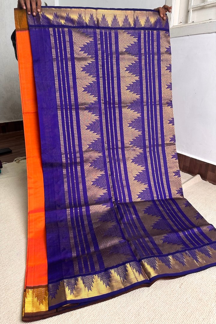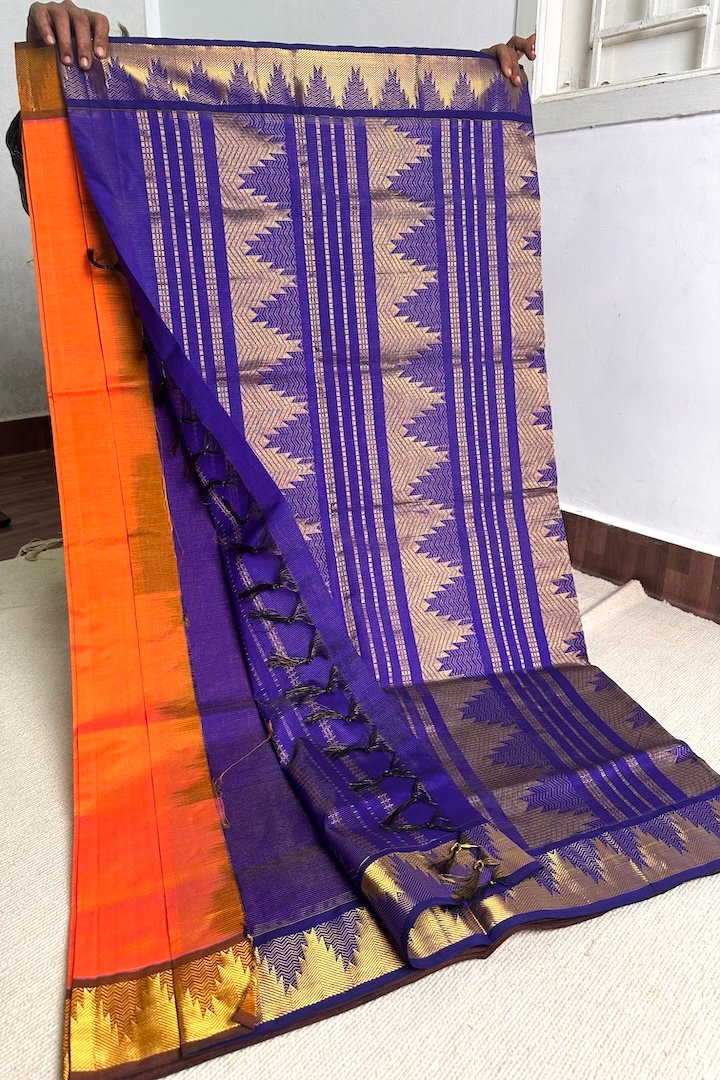 Vibrant 7 yards Vaira Oosi Semi Silk Cotton sarees with contrast zari border, pallu and blouse. Perfect for the festive season, these sarees are extremely vibrant and are pleasing to the eye. The zari border on these sarees has traditional Kanchi designs like Mango, Rudraksham, Peacock, Parrot, Thazhampoo, Araimadam.