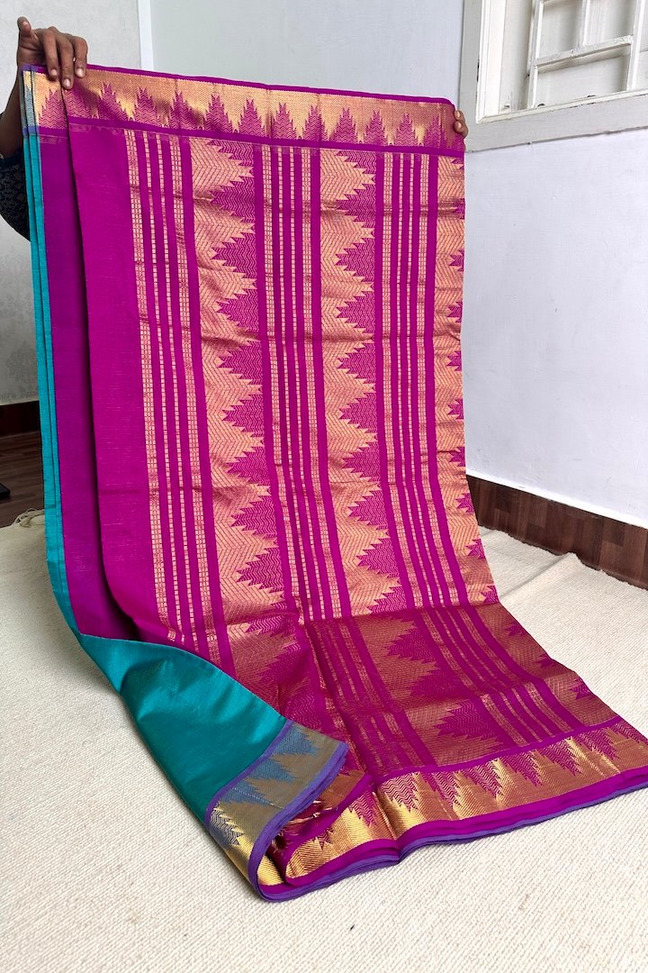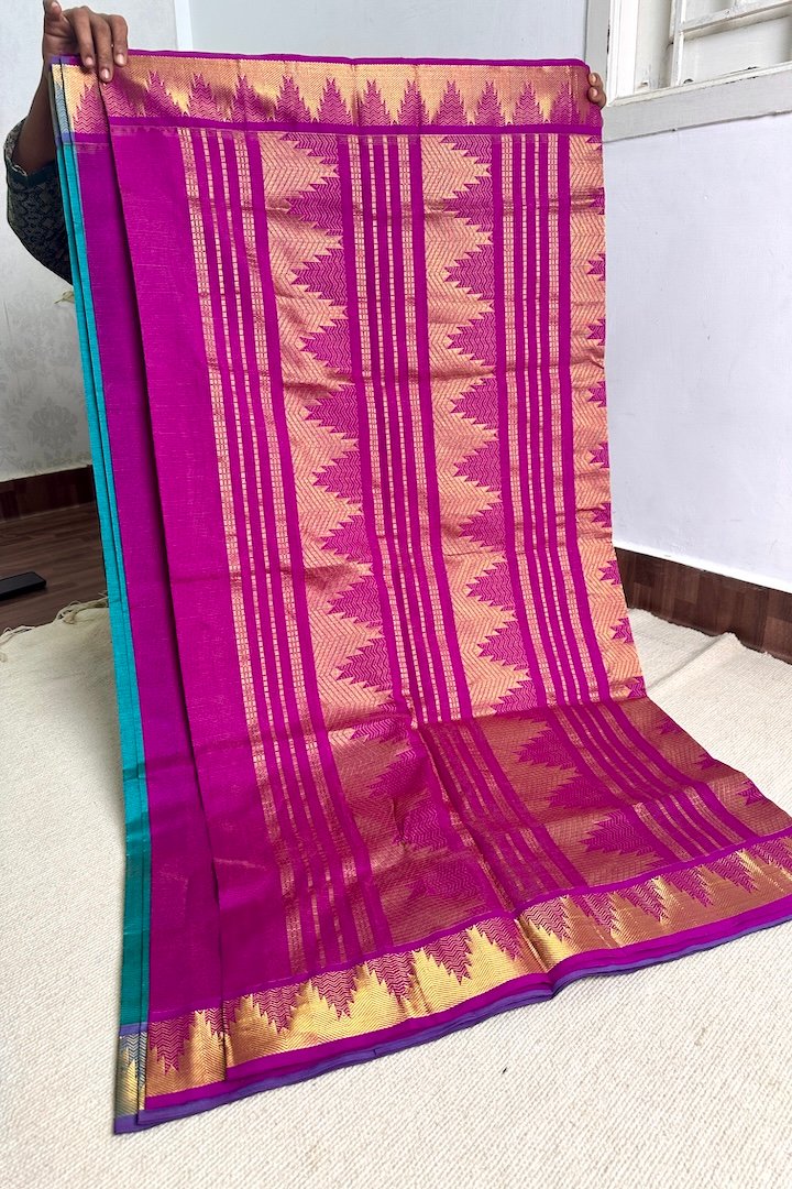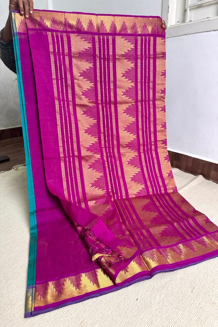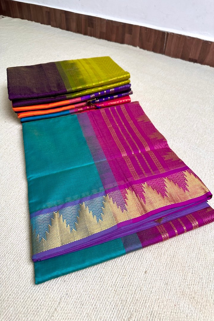 Vibrant 7 yards Vaira Oosi Semi Silk Cotton sarees with contrast zari border, pallu and blouse. Perfect for the festive season, these sarees are extremely vibrant and are pleasing to the eye. The zari border on these sarees has traditional Kanchi designs like Mango, Rudraksham, Peacock, Parrot, Thazhampoo, Araimadam.