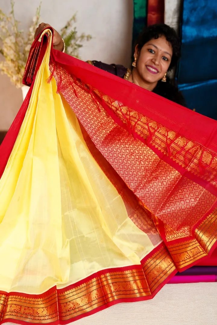 Kanchi Korvai Silk Cotton sarees are one of the most exquisite and divine weaves that come from the ancient town of Kanchipuram, Tamil Nadu. The motifs, designs and colours are a treat to the eyes of the beholder and the saree is a breeze to the one who drapes it. Korvai is a technique in which the body of the saree and border of the saree are woven separately and are woven together using another method.