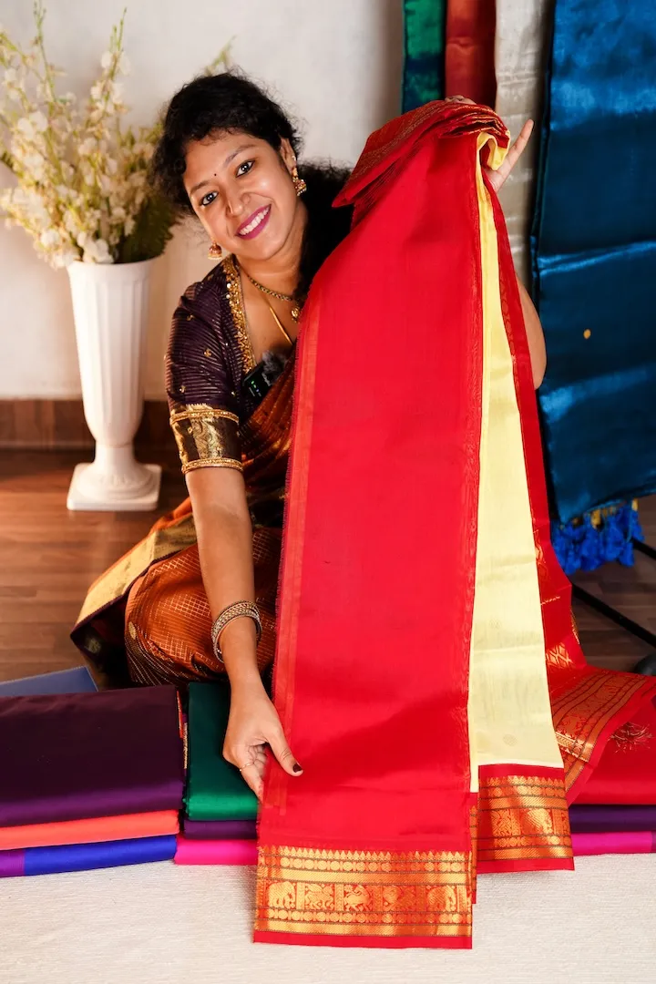 The Maharani Series is a collection of the finest handloom Kanchi silk cotton and Korvai silk cotton weaves in the most exquisite designs like Vaira Oosi, Mayil Chakram Kattam, Retta Pettu, Lakshadeepam, Vertical Zari Stripes, unique double zari (gold and silver) Elephant buttas, etc. Owning a Kanchi silk cotton is like owning a piece of tradition.