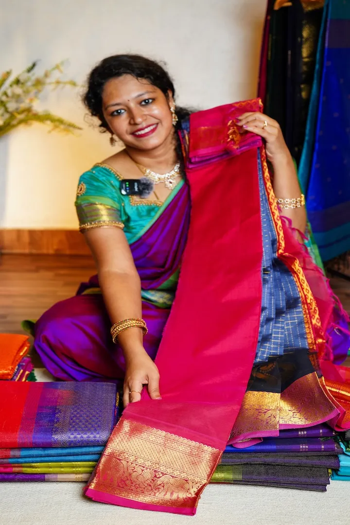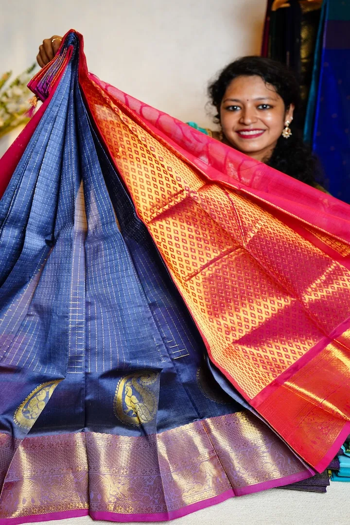 The Maharani Series is a collection of the finest handloom Kanchi silk cotton and Korvai silk cotton weaves in the most exquisite designs like Vaira Oosi, Mayil Chakram Kattam, Retta Pettu, Lakshadeepam, Vertical Zari Stripes, unique double zari (gold and silver) Elephant buttas, etc. Owning a Kanchi silk cotton is like owning a piece of tradition.
