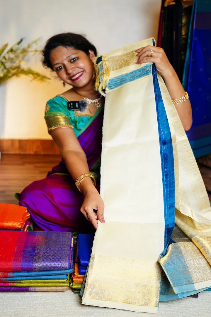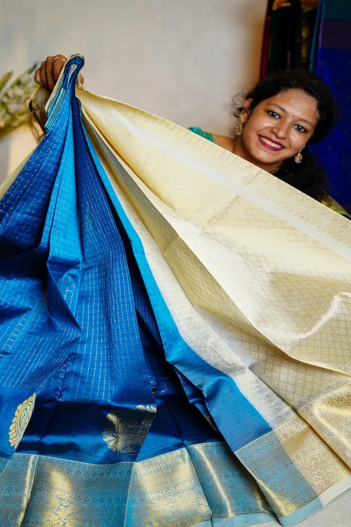 The Maharani Series is a collection of the finest handloom Kanchi silk cotton and Korvai silk cotton weaves in the most exquisite designs like Vaira Oosi, Mayil Chakram Kattam, Retta Pettu, Lakshadeepam, Vertical Zari Stripes, unique double zari (gold and silver) Elephant buttas, etc. Owning a Kanchi silk cotton is like owning a piece of tradition.
