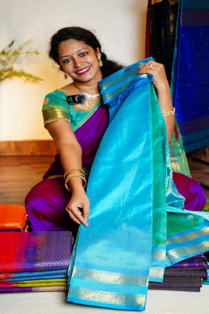 The Maharani Series is a collection of the finest handloom Kanchi silk cotton and Korvai silk cotton weaves in the most exquisite designs like Vaira Oosi, Mayil Chakram Kattam, Retta Pettu, Lakshadeepam, Vertical Zari Stripes, unique double zari (gold and silver) Elephant buttas, etc. Owning a Kanchi silk cotton is like owning a piece of tradition.
