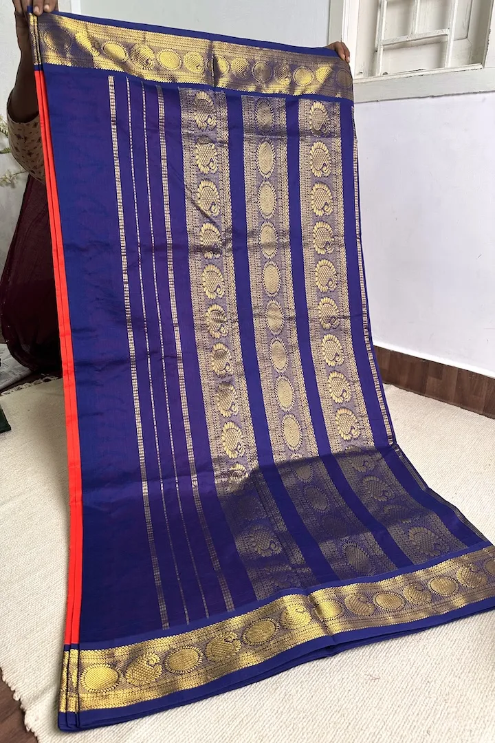 Vibrant 10 yards madisar Korvai and Plain Semi Silk Cotton sarees with contrast zari border and pallu. Perfect for the festive season, these sarees are extremely vibrant and are pleasing to the eye. The zari border on these sarees has traditional Kanchi designs like Mango, Rudraksham, Peacock, Parrot, Thazhampoo, Araimadam.