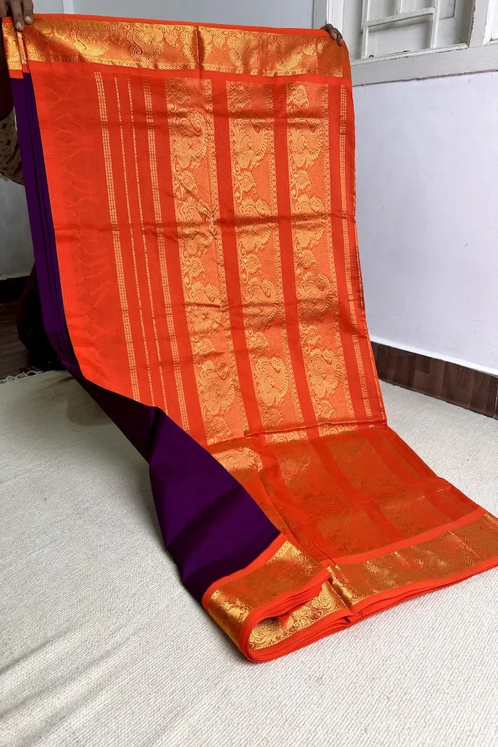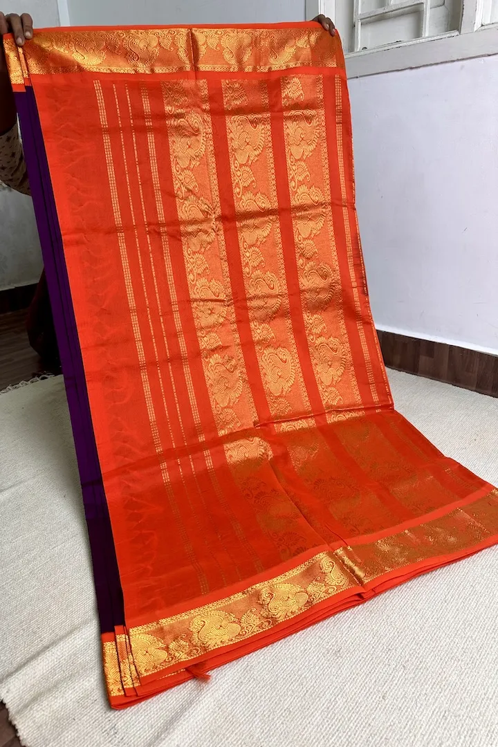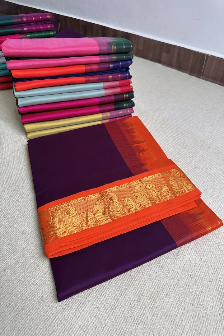 Vibrant 10 yards madisar Korvai and Plain Semi Silk Cotton sarees with contrast zari border and pallu. Perfect for the festive season, these sarees are extremely vibrant and are pleasing to the eye. The zari border on these sarees has traditional Kanchi designs like Mango, Rudraksham, Peacock, Parrot, Thazhampoo, Araimadam.