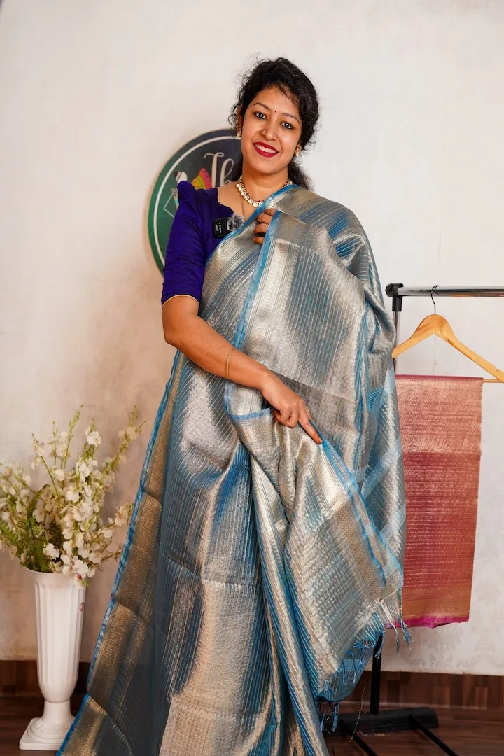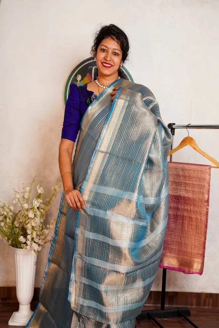 Stunning tissue sarees with horizontal stripes that are extremely light weight and easy to drape. Has a beautiful shine on the body.