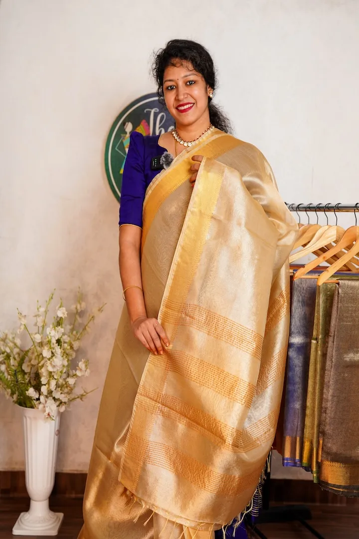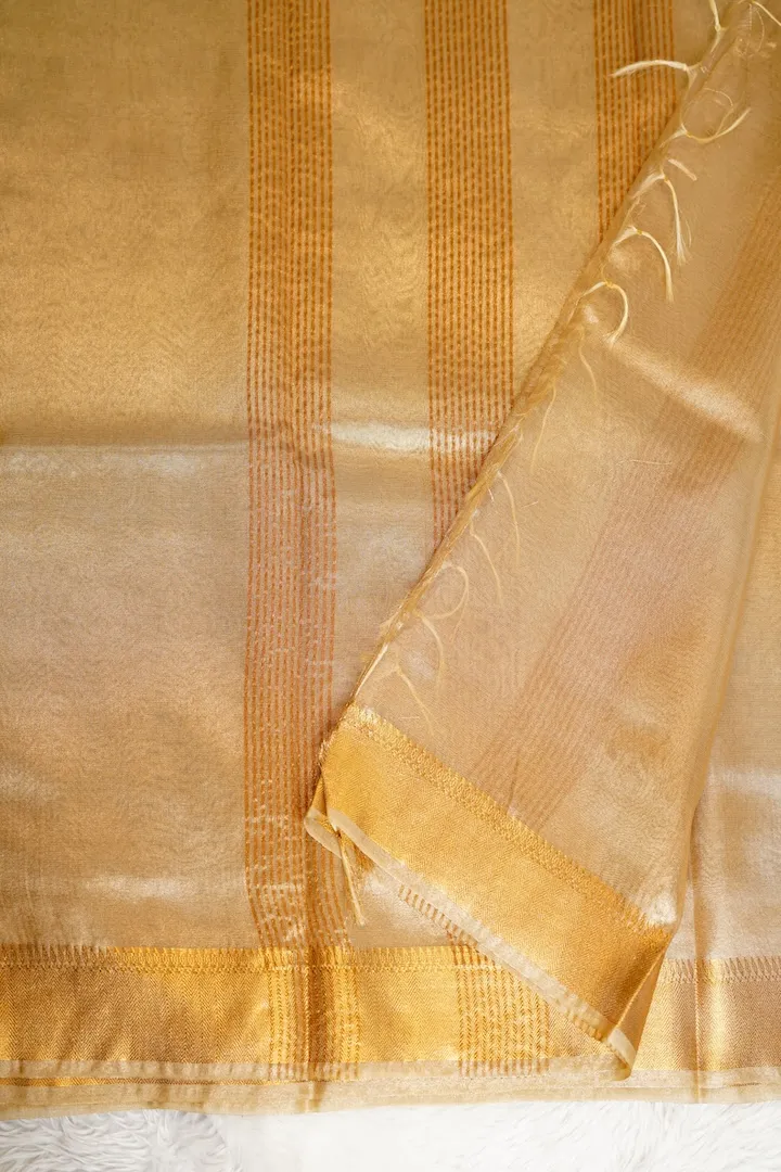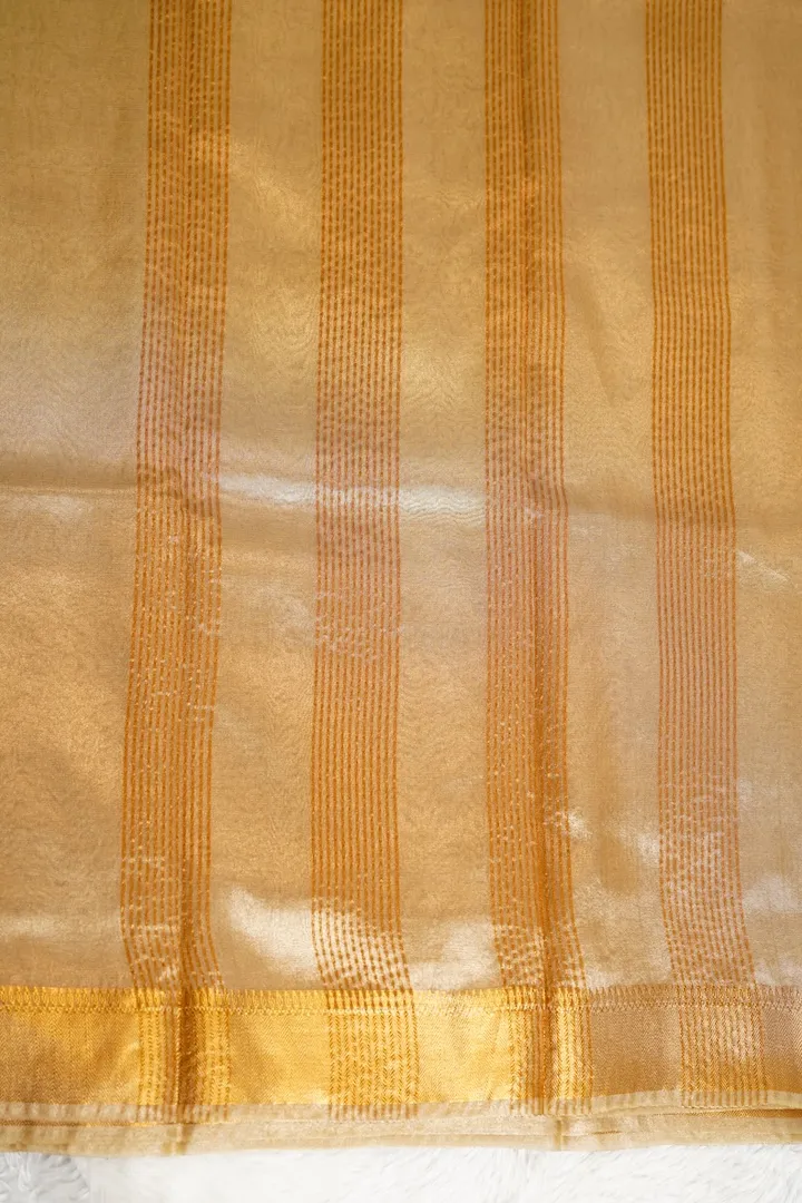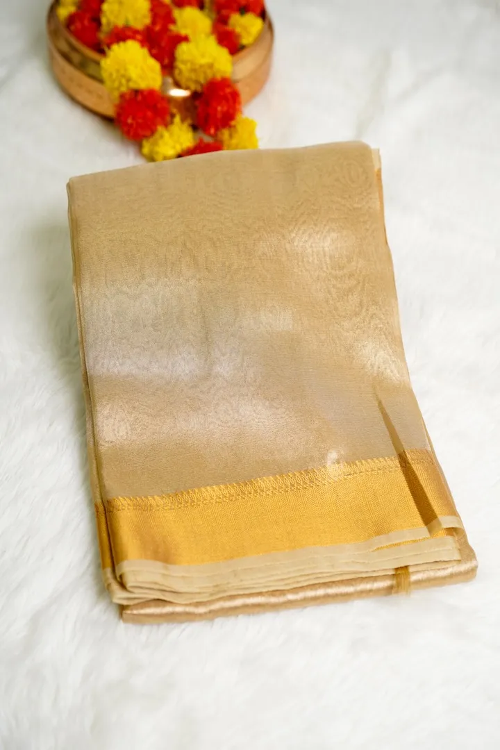 Stunning tissue sarees that are extremely light weight and easy to drape. Has a beautiful shine on the body and a golden border.