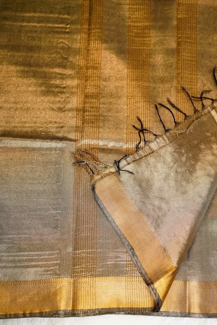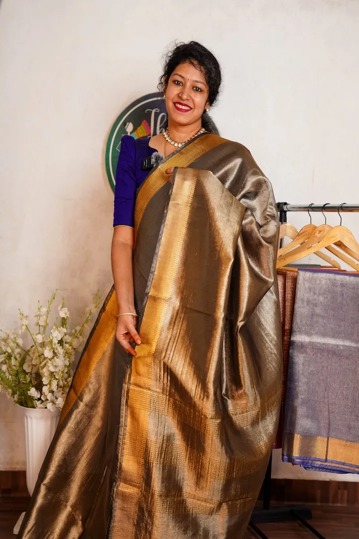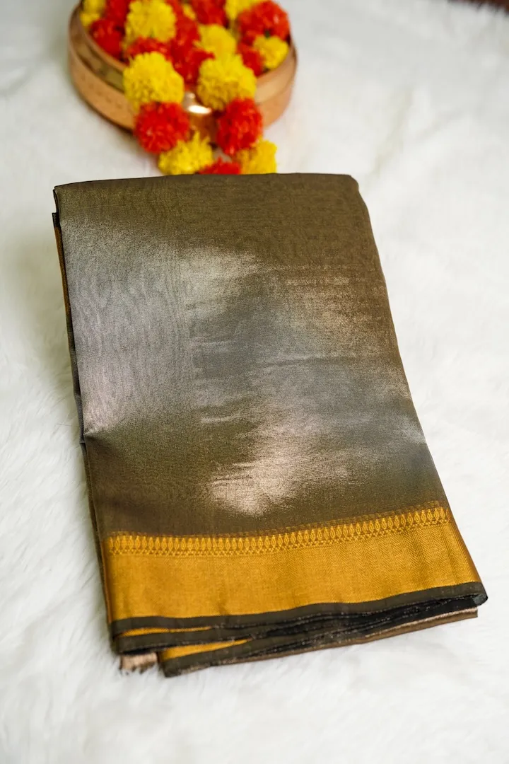 Stunning tissue sarees that are extremely light weight and easy to drape. Has a beautiful shine on the body and a golden border.