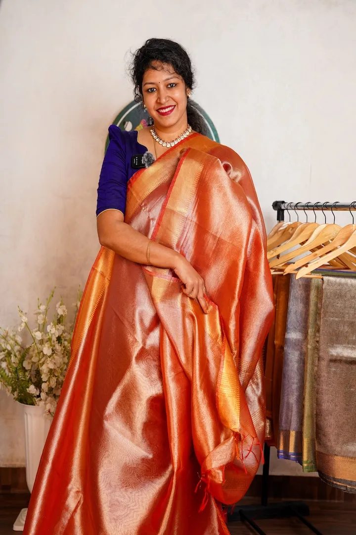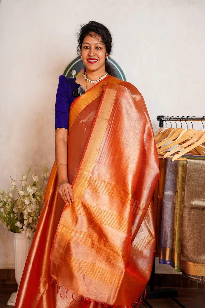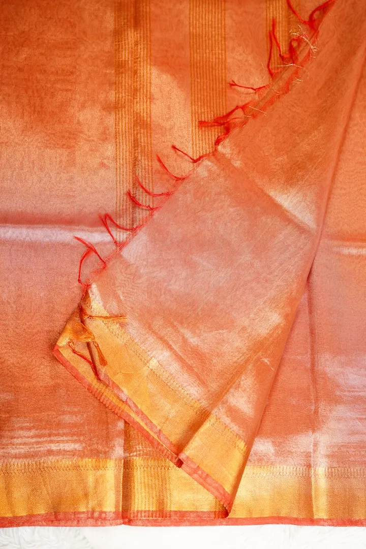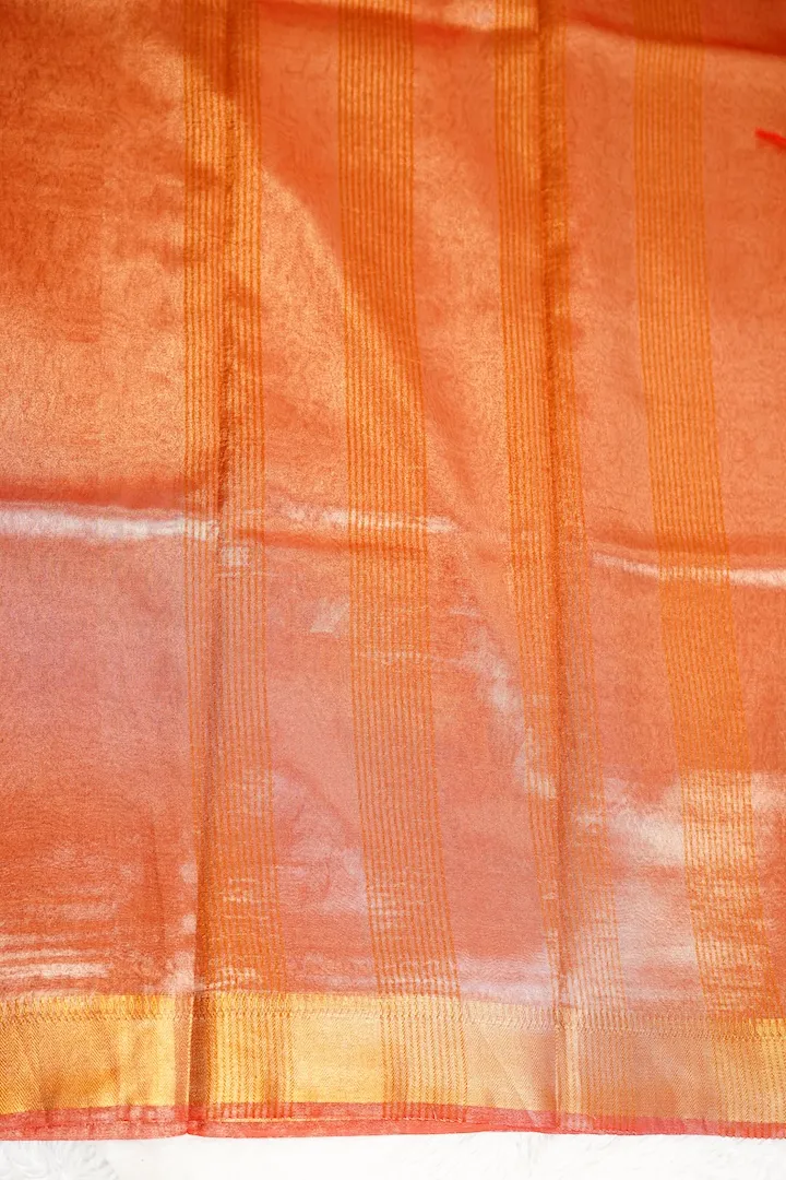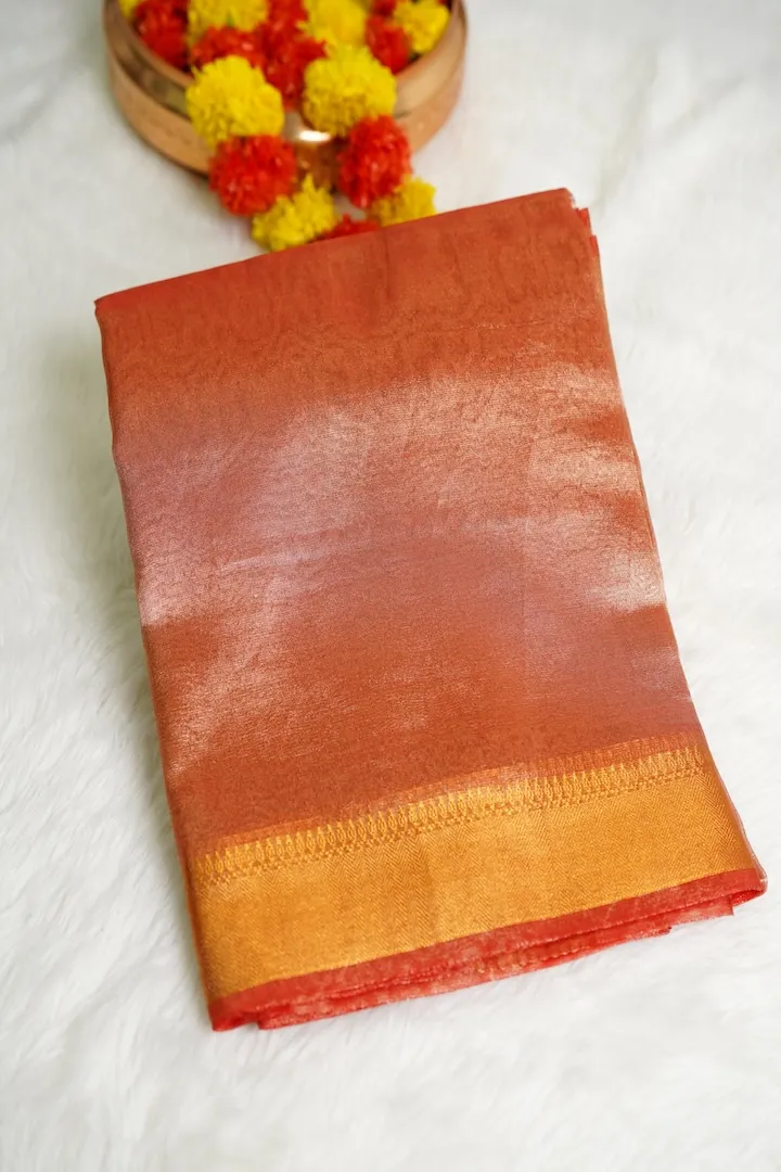 Stunning tissue sarees that are extremely light weight and easy to drape. Has a beautiful shine on the body and a golden border.