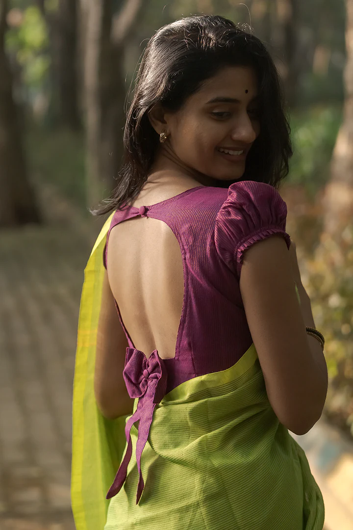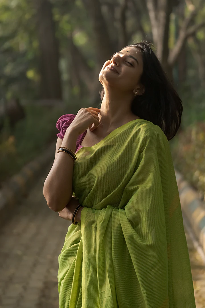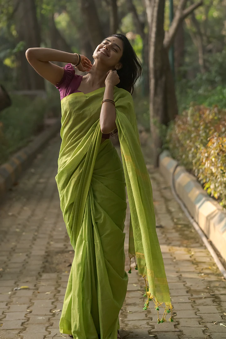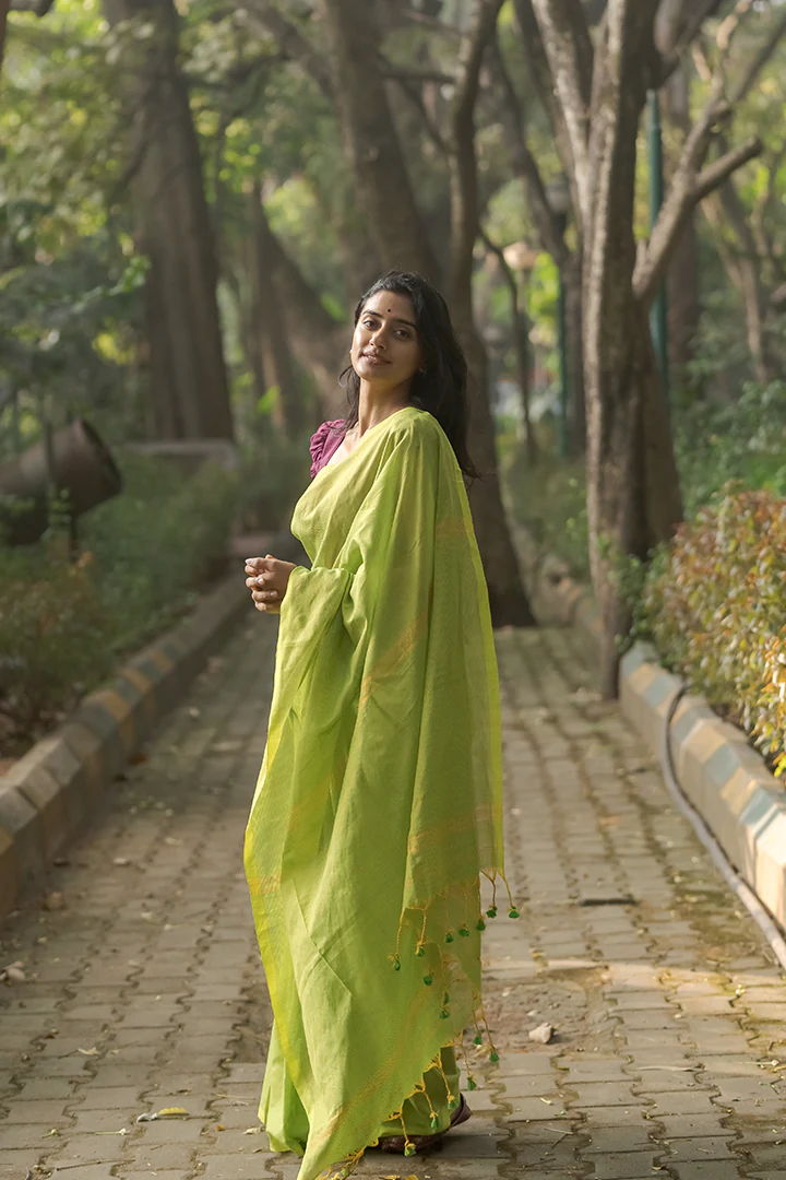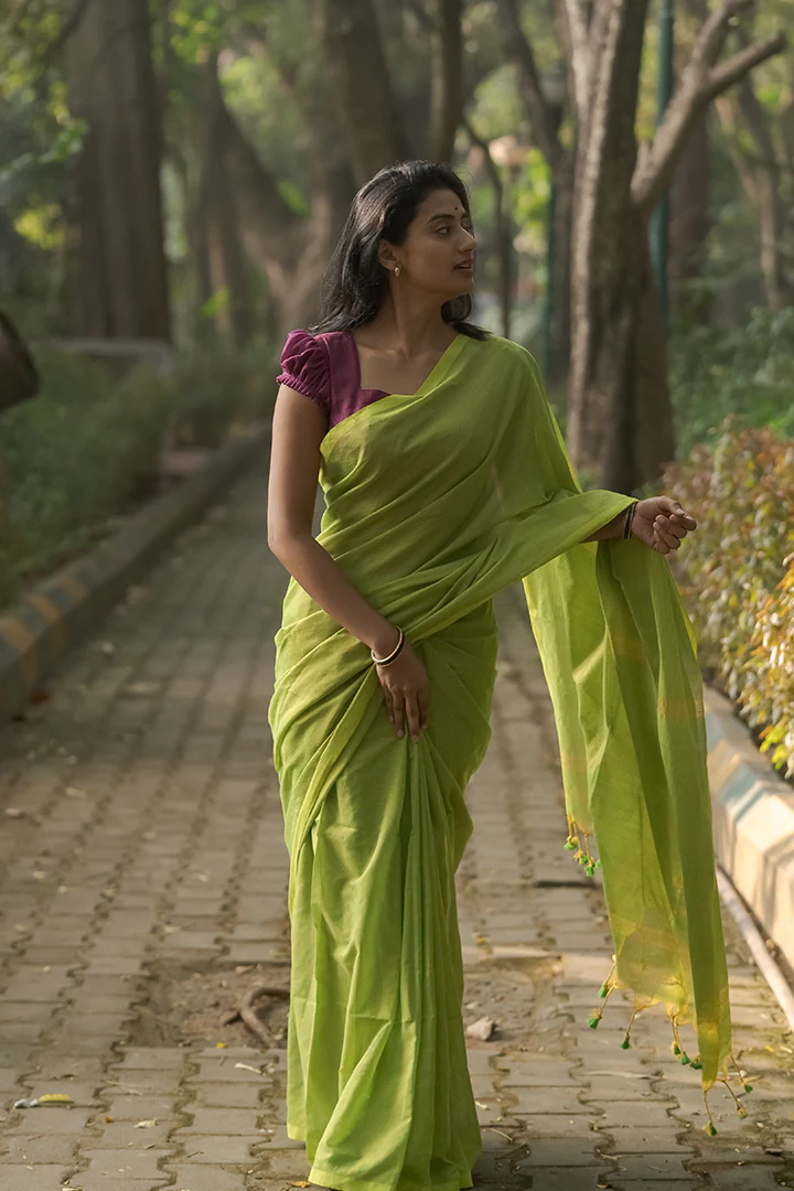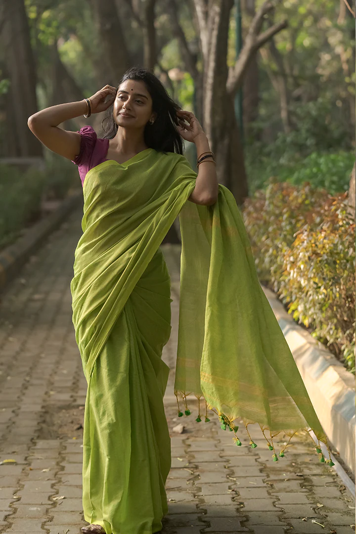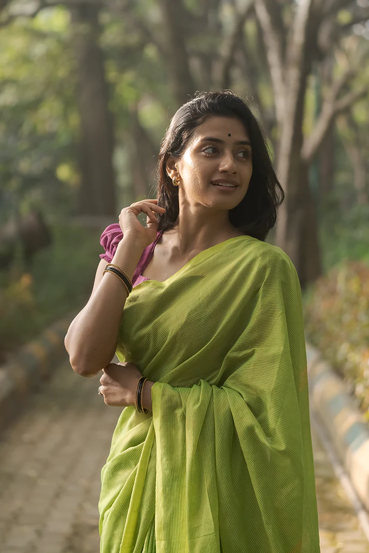 Green colour soft cotton saree with woven soft zari lines comes with contrast blouse.