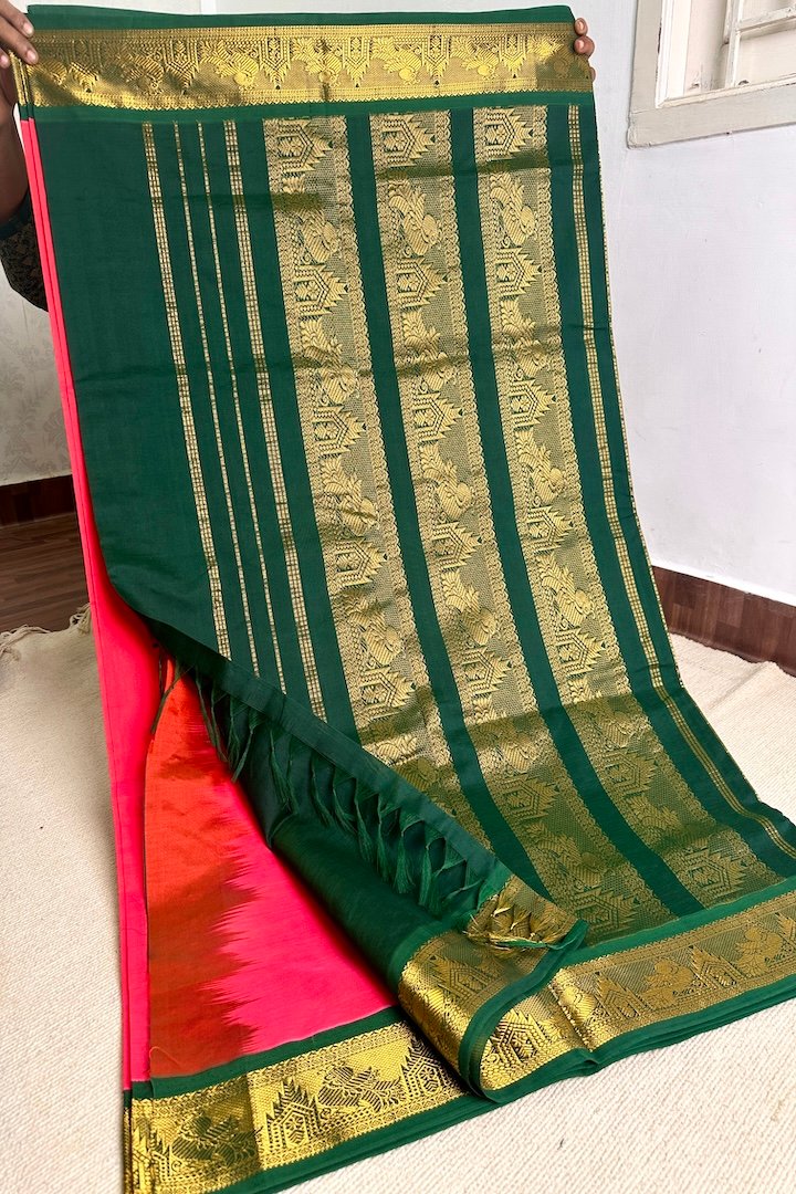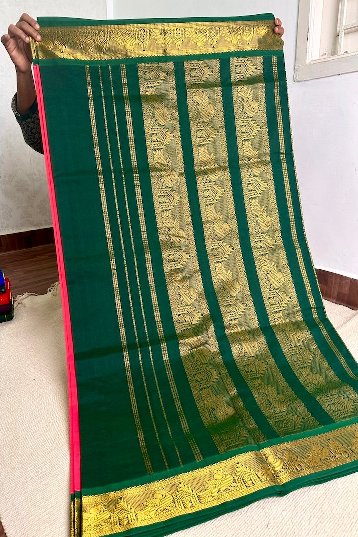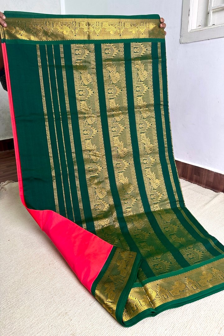 Vibrant 7 yards Korvai and Plain Semi Silk Cotton sarees with contrast zari border, pallu and blouse. Perfect for the festive season, these sarees are extremely vibrant and are pleasing to the eye. The zari border on these sarees has traditional Kanchi designs like Mango, Rudraksham, Peacock, Parrot, Thazhampoo, Araimadam.