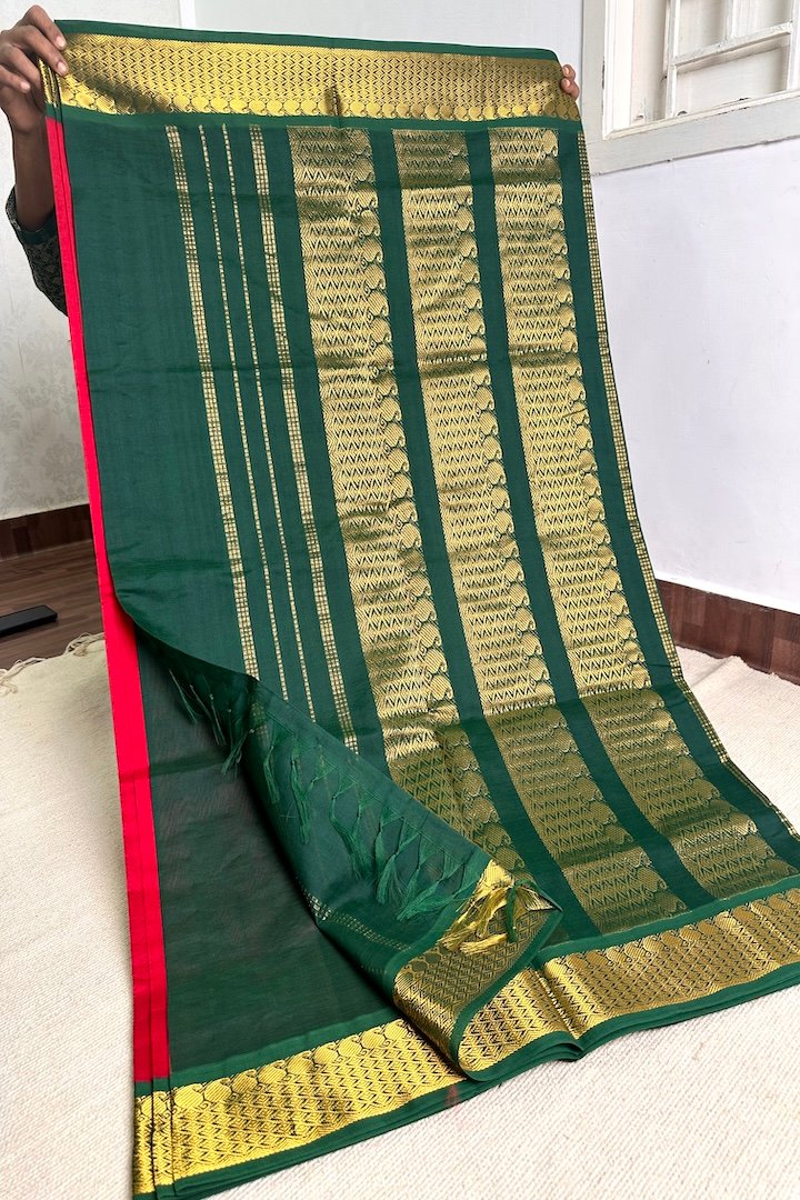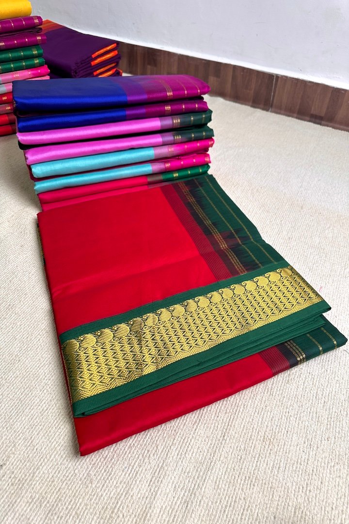 Vibrant 7 yards Korvai and Plain Semi Silk Cotton sarees with contrast zari border, pallu and blouse. Perfect for the festive season, these sarees are extremely vibrant and are pleasing to the eye. The zari border on these sarees has traditional Kanchi designs like Mango, Rudraksham, Peacock, Parrot, Thazhampoo, Araimadam.