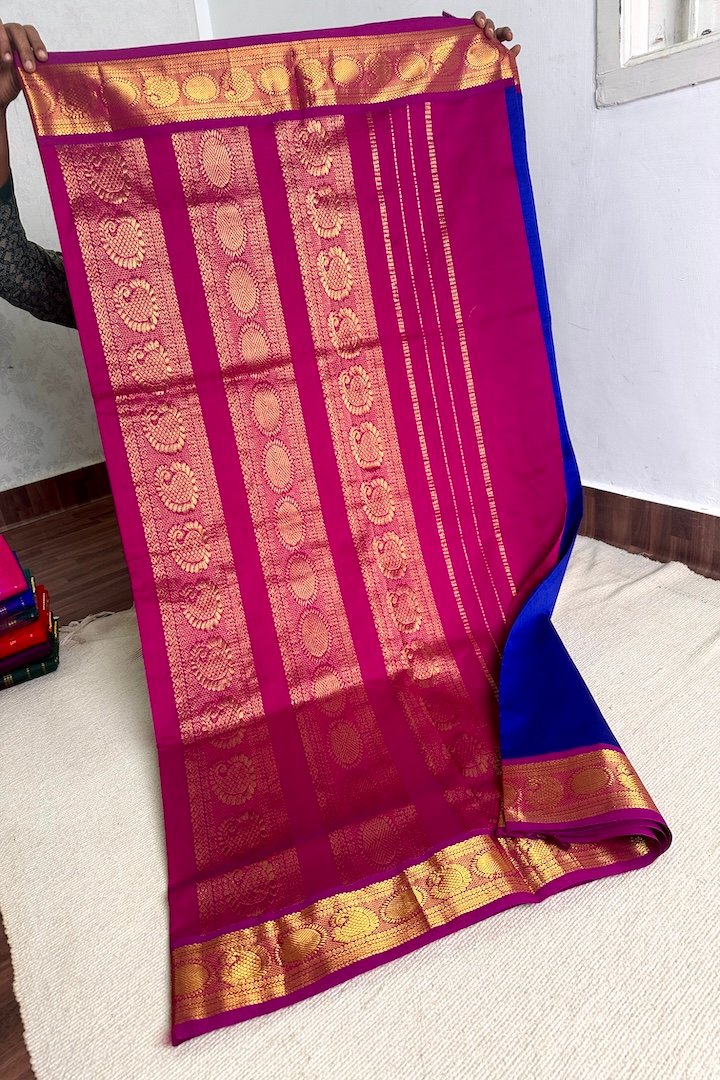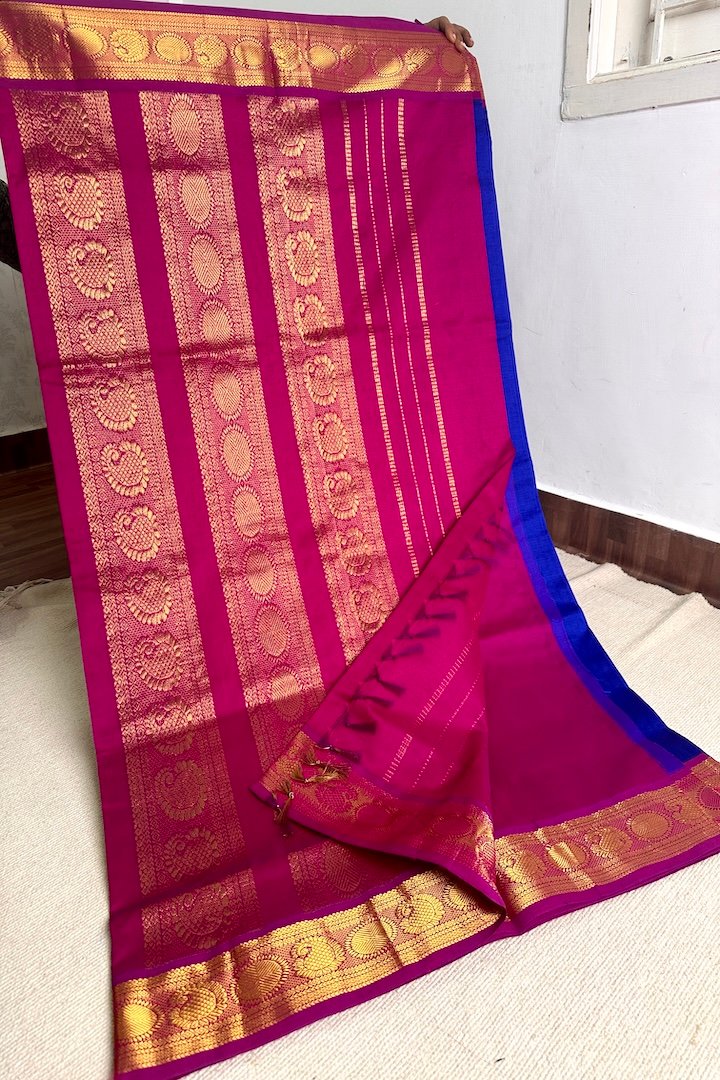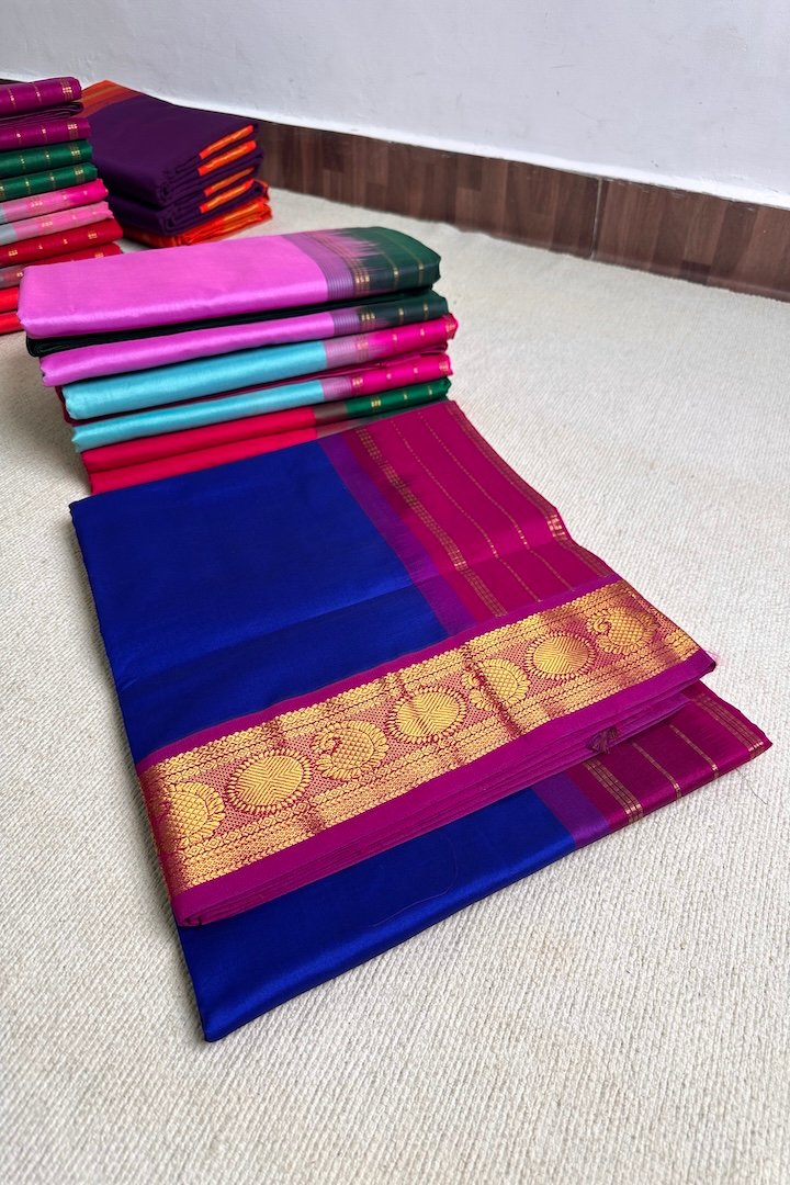 Vibrant 7 yards Korvai and Plain Semi Silk Cotton sarees with contrast zari border, pallu and blouse. Perfect for the festive season, these sarees are extremely vibrant and are pleasing to the eye. The zari border on these sarees has traditional Kanchi designs like Mango, Rudraksham, Peacock, Parrot, Thazhampoo, Araimadam.