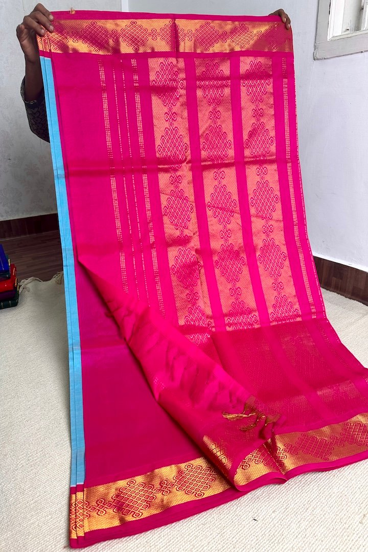 Vibrant 7 yards Korvai and Plain Semi Silk Cotton sarees with contrast zari border, pallu and blouse. Perfect for the festive season, these sarees are extremely vibrant and are pleasing to the eye. The zari border on these sarees has traditional Kanchi designs like Mango, Rudraksham, Peacock, Parrot, Thazhampoo, Araimadam.